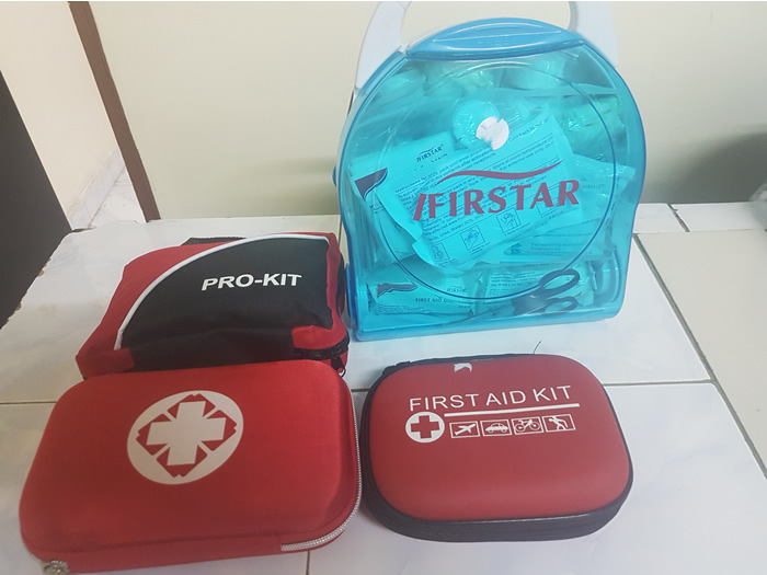 A small box containing items such as antiseptic wipes, bandages,cotton swabs for use in giving help to a sick or injured person until treatment is available.